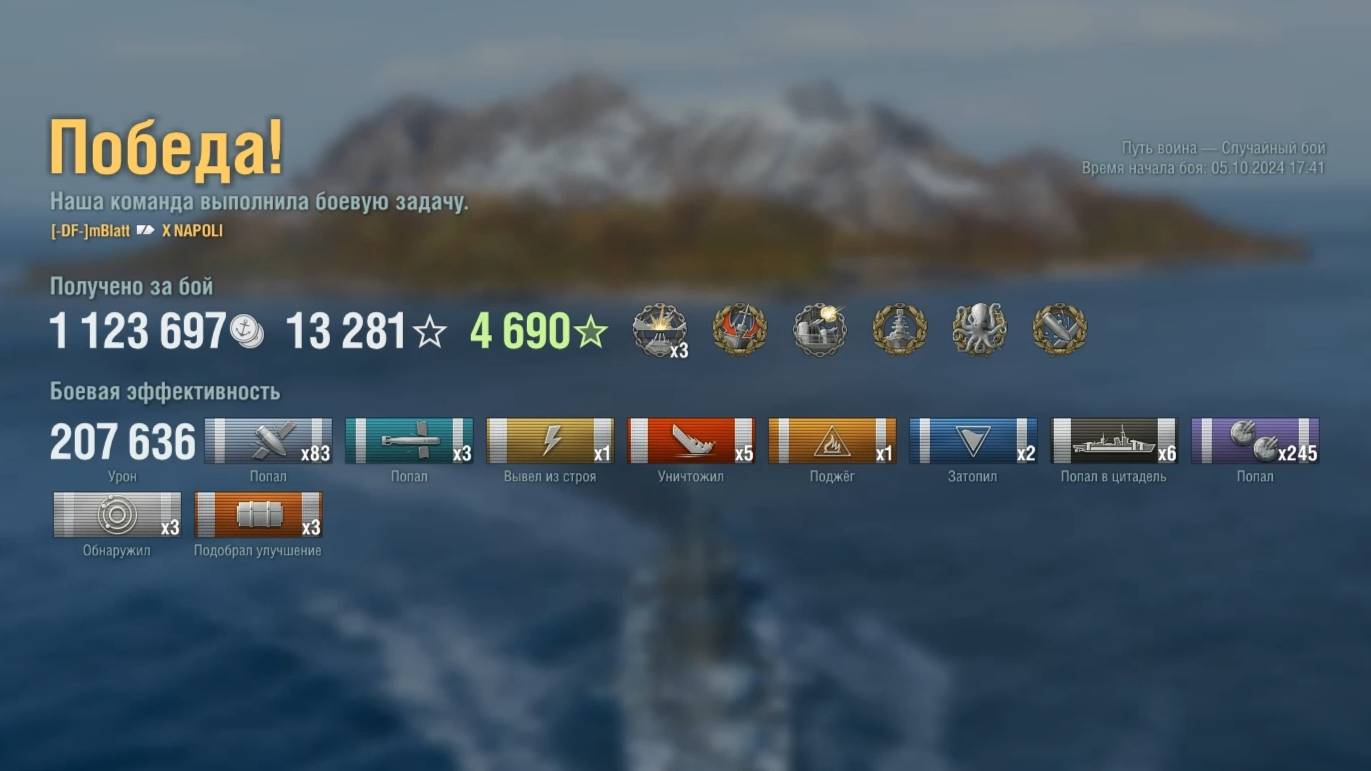 Крейсер Napoli Игрок: mBlatt (NA) Карта: Путь воина - Случайный бой Урон: 207к Napoli- Крейсер Италии 10 уровня