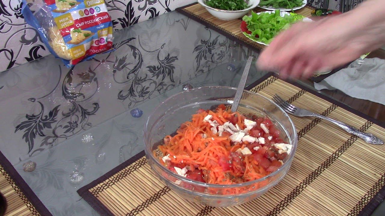 Куриная грудка-300 гр Морковь по-корейски-200 гр Помидор свежий-2 шт Тёртый сыр-200 гр Базилик- приправа сушеная, чеснок, соль-по вкусу Чеснок-1 зубчик Заправка: майонез, сметана в равных пропорциях или йогурт Ссылка на сочную куриную грудку: https://youtu.be/S27vAJ8bpqQ
