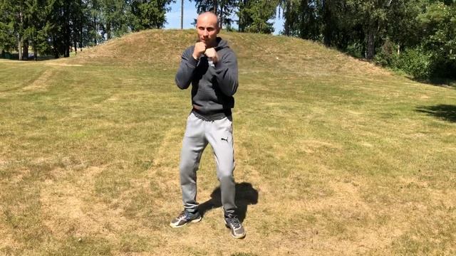 Двойной блок с отходом назад—Левый прямой с шагом вперед—Правый прямой на месте—Левый апперкот с шагом вперед--Правый боковой в туловище на месте—Правый прямой с шагом назад—Левый боковой (свинг) с шагом назад—Правый апперкот на месте—Левый прямой с шагом вперед—Левый апперкот с шагом вперед. ------------------------------------------------------------------------------------------------------------------------------------------------------------ Комбинации для изучения и отработки боксерской техники. Каждая комбинация представляет собой имитацию мини-боя с элементами защиты, атаки, контратаки. Данное обучение тем, кто тренируется самостоятельно, либо же может быть частью тренировочного процесса. Отрабатывать комбинацию минимум 100 раз с заменой на новую при каждой последующей тренировке. Желательно обращать внимание на правильность выполнения, однако ошибки допускаются. Основная цель - прочувствовать и наработать слаженность движений рук, ног, всего тела. Ну а процесс улучшения боксерской техники - бесконечен.