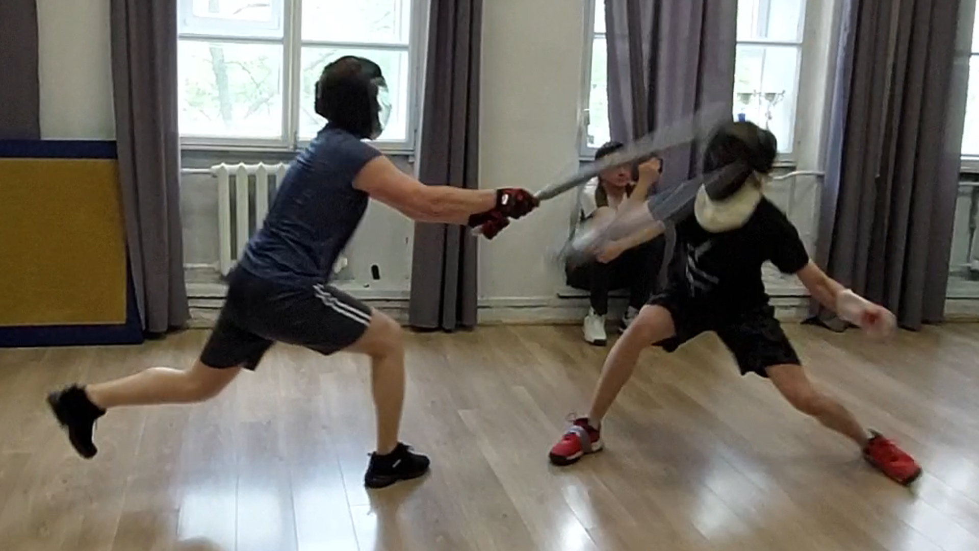 Фехтование японским мечом в школе кендзюцу - спарринг на длинных чанбара на занятии в Katana Club