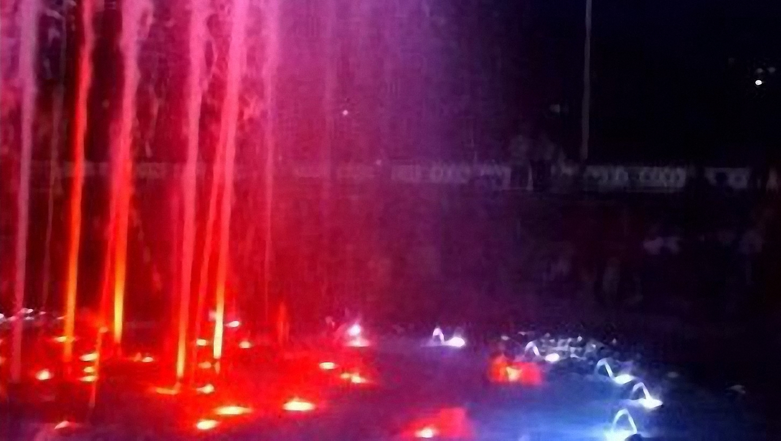 Сняли на видео, когда стемнело, светомузыкальный "танцующий" фонтан в городе Саратове и танцующую девочку рядом с фонтаном