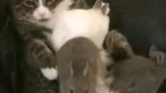 Кот ухаживает за кроликами