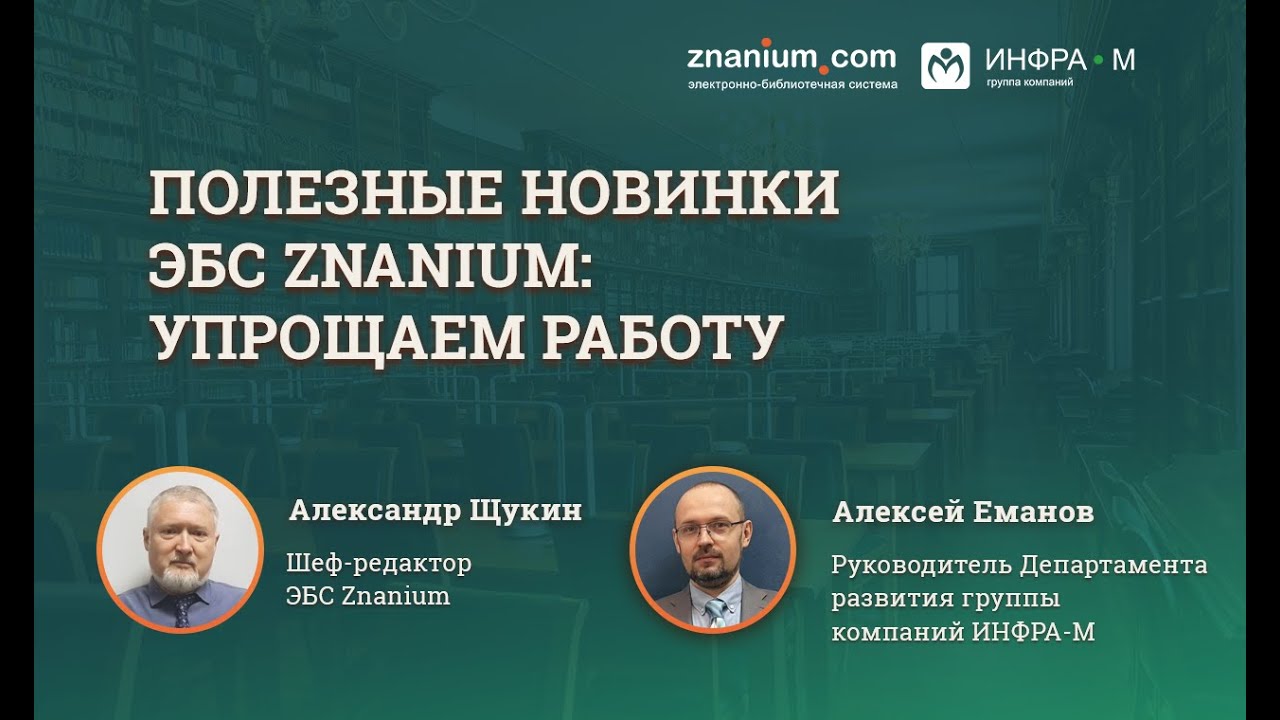 В этом видео с шеф-редактором ЭБС Znanium Александром Щукиным и руководителем Департамента развития ГК ИНФРА-М Алексеем Емановым вы узнаете: — почему полезно понимать, чем живёт ЭБС; — про сбывшиеся ожидания, новые сервисы и просто приятные мелочи; — какова ценность нового ридера; — мобильные новости для тех, кто в движении.