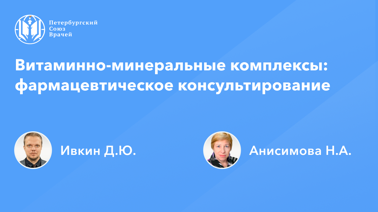 Видеозапись онлайн-семинара «Витаминно-минеральные комплексы: фармацевтическое консультирование» Дата проведения: 14.04.2023, 20:00 Страница мероприятия: https://spb.doctor/i/23041420/ Программа: 1. Витаминно-минеральные комплексы: фармацевтическое консультирование Ивкин Дмитрий Юрьевич 2. Витаминно-минеральные комплексы в репродуктивном здоровье женщины. Анисимова Наталья Аскольдовна 3. Ответы на вопросы О семинаре: Поливитаминные препараты обоснованно являются одними из самых распространенных средств «домашней аптечки», широко применяемых для улучшения самочувствия, профилактики заболеваний или в их комплексной терапии. Многие витамины и поливитаминные комплексы профилактического действия с однотипным составом и применением имеют разные регистрационные статусы – как лекарственные средства и как БАДы. В сознании населения активно циркулируют представления о безусловной полезности приема высоких доз витаминов и их безопасности, что далеко не всегда соответствует действительности. Поэтому фармацевтические работники должны уметь ориентироваться в ассортименте витаминно-минеральных комплексов.