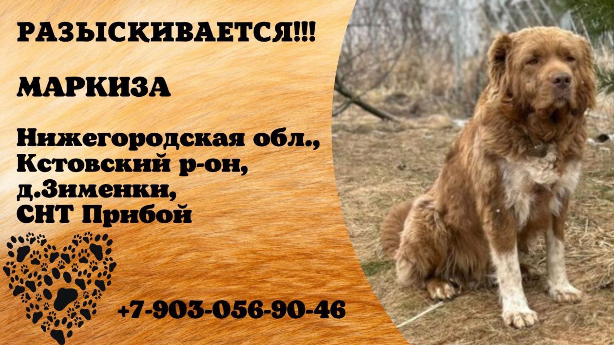 Нижегородская Кстовский р-он Пропала собака В середине июня пропала. Пожалуйста 🙏🏻 сделайте репост записи 🙏🏻 🆘Пропала собака 🐕 кличка Маркиза. Последний раз видели в районе СНТ Прибой д.Зименки. Собака большая, ярко рыжая с белыми пятнами на груди и на передних лапах. Контактная, Не агрессивна. Важна любая информация ! Тел. 89030569046 Наталья Инфо: https://vk.com/wall-198815410_200307 #пропала_собака#нижегородская#кстовский