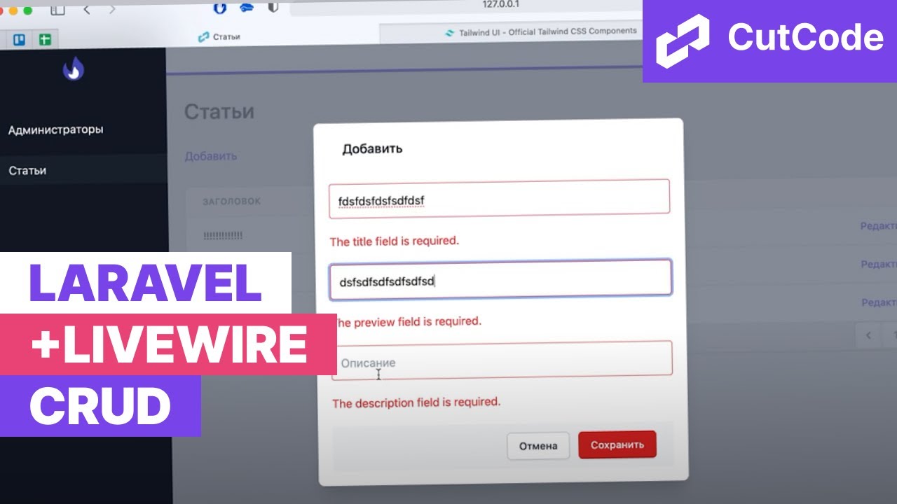 "Учимся работать с CRUD на Laravel с использованием Livewire. создание, просмотр, обновление и удаление записи на Ларавел 8. #laravelCRUD#laravel#cutcode --------------------------------------------------------------------------------- ❗️❗️❗️как делать сложные сайты на laravel? Это просто с cutcode! Поддерживай мой проект - https://cutcode.dev/?utm_source=rt Угостить меня кофе - buymeacoffee.com/cutcode ???Мой помощник Тэйлор готов выдать тебе подарок. Забирать тут - https://cutcode.dev/chat-bot?utm_source=rt --------------------------------------------------------------------------------- ⏰ Таймкоды: 00:00 Введение и постановка задачи 01:10 Как устанавливать alpine.js 01:50 Создаём и настраиваем livewire компонент posts 07:08 Настраиваем pop-up 09:48 Добавляем методы crud системы 17:12 Добавляем форму с полями для редактирования 21:24 Проверка работоспособности и отладка 23:45 Добавление элемента загрузка 25:15 Добавление типа Eloquent модели 27:50 Добавление alpine.js в модалку 28:50 Подведение итогов Друзья всех приветствую на канале Cutcode! Cегодня у нас интересное видео, которое облегчит жизнь вам в разработке CRUD функционала. Мы уже делали CRUD на Laravel в курсе уроков по Laravel с нуля. Кто не смотрел - ссылку я добавлю в описании. Кто не знает что такое CRUD то здесь все просто - это набор функционала который выполняет следующие действия: просмотр записей, добавления, редактирования и удаления. То есть это аббревиатура на английском Create Read Update Delete. Сегодня же мы выполним с вами CRUD с использованием livewire и уложим все это в один компонент. Добавление и редактирование мы реализуем с помощью модального окна. Кто-то у меня как раз просил показать как это делается в livewire. Заодно и посмотрим. По стэку будем использовать Tailwind, Laravel и Livewire соответственно и добавим еще alpine.js. Его будет немного, но с ним так же поработаем для примера. Ну не будем затягивать погнали! --------------------------------------------------------------------------------- ? делитесь этим видео с друзьями: https://www.youtube.com/watch?v=fNaZXfHfzBg ? подпишитесь на YouTube-канал: https://www.youtube.com/channel/UCkKZ3S8JiB5nUAaTYhpCwzQ?sub_confirmation=1 ? Курс по Laravel с нуля: https://www.youtube.com/watch?v=phTSw6XDATw&list=PLTucyHptHtTkUbXaikXEmCWL8GradRx9I Laravel Livewire CRUD (create read update delete) - создание, просмотр, обновление и удаление записи --------------------------------------------------------------------------------- ? наш сайт: https://cutcode.dev/?utm_source=rt ? наш instagram: https://www.instagram.com/cutcoderu/ ? Наш telegram-канал: https://t.me/laravel_cutcode"