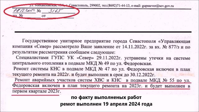 Новости ЖКХ из МКД 55 по ул. Федоровской в Севастополе.