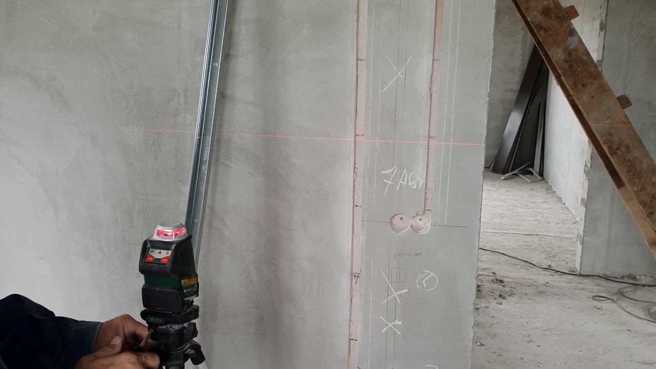 Работаем с лазерным нивелиром, размечаем штробы для чернового электромонтажа, все перпендикулярно и параллельно)