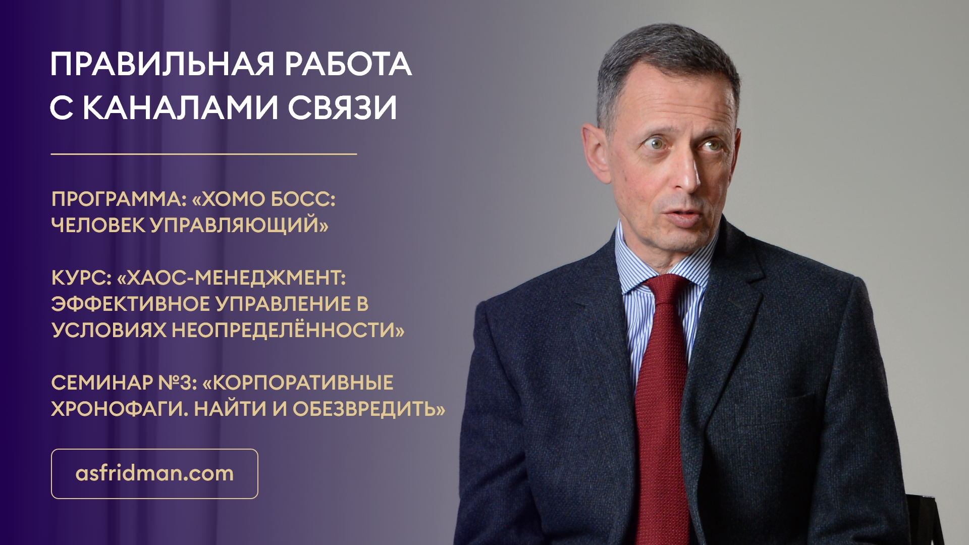 Правильная работа с каналами связи Программа: «Хомо Босс: Человек Управляющий» Курс: «Хаос-Менеджмент: Эффективное управление в условиях неопределённости» Семинар №3: «Корпоративные хронофаги. Найти и обезвредить» Расписание открытых семинаров Александра Фридмана: https://www.asfridman.com/raspisanie/