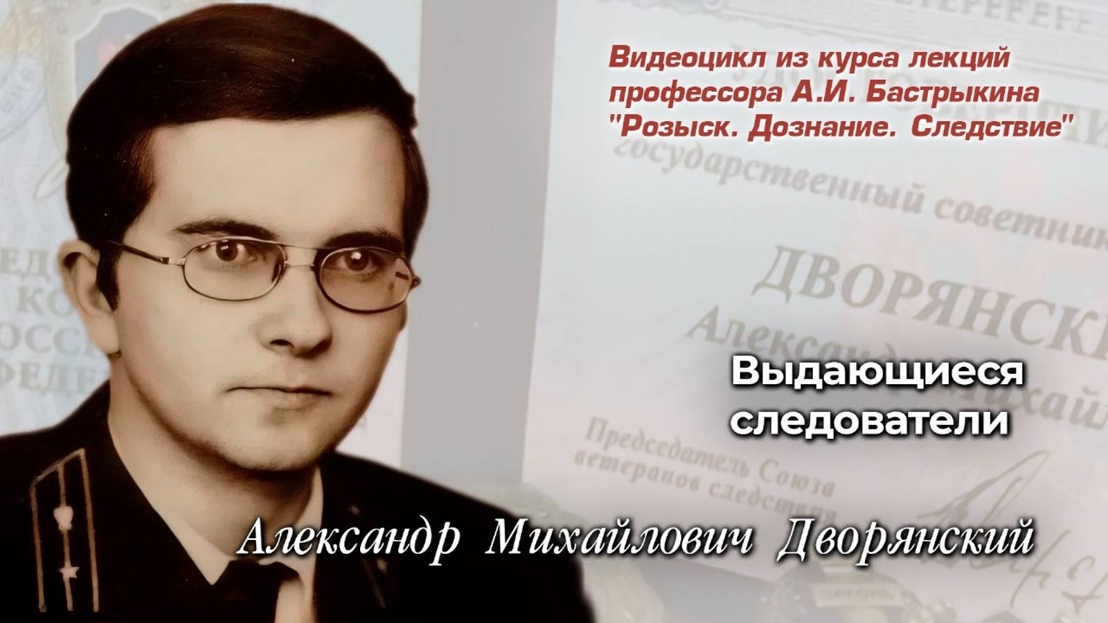 Александр Михайлович Дворянский, опытный юрист и профессионал своего дела, начал службу в органах ещё в 1975 году. За свою карьеру он прошёл путь от следователя Гатчинской городской прокуратуры до руководителя Северо-Западной транспортной прокуратуры и ректора Санкт-Петербургского юридического института Генеральной прокуратуры Российской Федерации. На протяжении многих лет Александр Михайлович занимался расследованием самых запутанных и резонансных дел, в каждом из которых им был продемонстрирован высокий уровень профессионализма и умение работать с самыми сложными ситуациями. Подробнее - в видео из элективного курса лекций профессора А.И. Бастрыкина "Розыск. Дознание. Следствие". #АИБастрыкин #АлександрБастрыкин #Бастрыкин #БастрыкинПрофессор #БастрыкинЛекции #ИсторияСледствия #ВыдающиесяСледователи #ДворянскийАМ