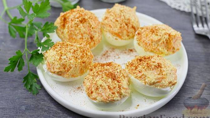 Яйца, фаршированные морковью и плавленым сыром, – сытная закуска, которую можно приготовить и к праздничному столу, и на каждый день. Измельчённая сырая морковь придаёт начинке сочность, а плавленый сыр делает закуску более нежной. #Яйца #ЯйцаФаршированные #ЗакускаИзЯиц #ЯйцаФаршированныеМорковью
