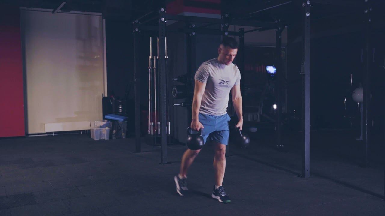 Попеременные выпады шагом назад с двумя гирями/ alternative reverse dual KB lunges