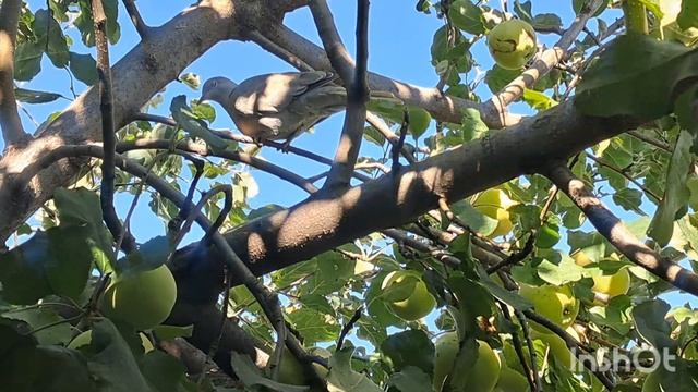 На ветке яблони сидит красивый голубь.