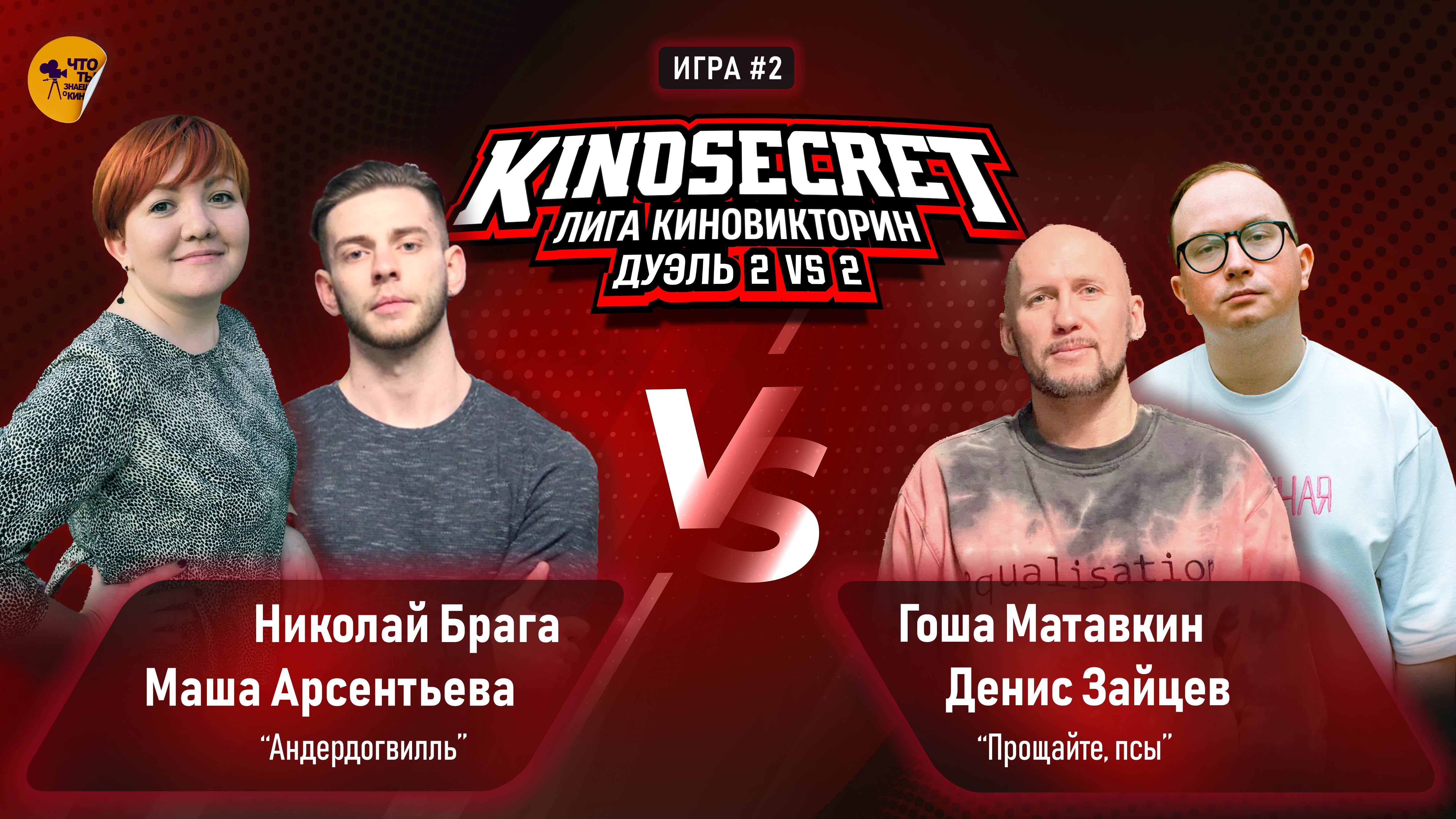 Лига КиноВикторин - большой проект, который объединяет киноманов со всего мира. Одним из форматов Лиги является игра КиноСекрет.Дуэль. КиноСекрет.Дуэль 2 на 2 - это игра в которой 2 участника из одной команды и 2 участника из другой выясняют кто из них лучше всего разбирается в кинематографе. Участники игры: Команда "Андердогвилль": Мария "Капитан Истерика" Арсентьева и Николай "Тони Лайф" Брага Команда "Прощайте, псы": Гоша "Мистер Оранжевый" Матавкин и Денис "Мистер Розовый" Зайцев За кого болеете вы? -------------- Звук в игре от Kazaku Records Аранжировки , сведение , мастеринг ? ? ? https://www.youtube.com/channel/UCMPnxwJV2h5RideLcKU7cHw -------------- Монтаж игры - Степан Пинигин (https://t.me/sp_videomaker) ------------- Если вы хотите поддержать наш проект, это можно сделать по ссылке: https://boosty.to/kinosecret/donate Если вы хотите, чтобы ваши вопросы прозвучали в одном из ближайших выпусков, отправляйте свои наброски на почту - info@kinosecret.com Если вы хотите принять участие в записи Своей Игры среди подписчиков канала, выполните действия, которые описаны в этом видео - https://youtu.be/AYPrJH0AJ_I -------------- Таймлайн: 00:00 - Вводная информация об игре 03:30 - Приветствие игроков 12:55 - Первый раунд 26:40 - Второй раунд 45:31 - Третий раунд 58:42 - Четвертый раунд -------------- Наш телеграм канал - https://t.me/QuizKinoSecret Наш сайт - http://www.kinosecret.com/ Наши игры в Иркутске - https://vk.com/kinosecret Наши подкасты - https://kinosecret.mave.digital/ Наш инстаграм - https://www.instagram.com/kinosecret_quiz/ Наша группа в ВК - https://vk.com/kinosecret_russia По условиям франшизы - http://www.kinosecret.com/franshisa/ -------------- #киносекрет #KinoSecret #свояигра #квиз #quiz #квизонлайн #квизкино #киноквиз #квизкиноимузыка #викторина #киновикторина #онлайнкиноквиз