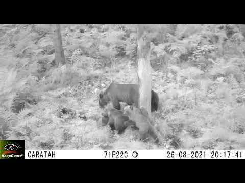 Медведица с медвежатами попала в объектив камеры видеорегистратора вблизи кордона Караташ. Юрий Николаевич Калинкин, к.б.н., ведущий научный сотрудник Алтайского заповедника прокомментировал, что это медвежата все этого года - они заметны по поведению: любопытны, игривы. На вид представители семейства упитанные. Ситуация с кормами медведя в этом году на грани - ореха мало и он только по низкогорьям, однако много рябины, есть другие ягоды, что должно помочь прокормиться мохнатому семейству до наступления холодов… Установка видео регистратора - государственный инспектор С. Кульбацкая.