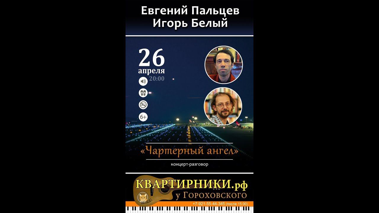 Евгений Пальцев (Санкт-Петербург) и Игорь Белый (Москва). "Чартерный ангел". Концерт-разговор. Квартирник у Дмитрия Гороховского. Санкт-Петербург. 26 апреля 2018 г. Запись видео - Алла Левитан. Прозвучали песни: 1. Игорь: Карманный ангел ("Кто прячет секреты в глухих закромах...») 2003 2. Женя: Ангелы в отпуске "Ангелы из отпуска на небо летят...») 1995 3. Игорь: Два дыхания («Что за песенка – два дыхания...») 1997 4. Женя: Маленькая ночная песенка («Тишина пробила брешь…» 2018 5. Игорь: Автостоп («Кто, кто остановится в темную ночь на руку...») 1997 6. Женя: Баллада о королевской любви («Королева не любила короля…») 1993 7. Игорь: Камнерез 1996 («Вершина камня – плиты гранита...») 1996 8. Женя: Король в ссылке («Хочешь сказку – так изволь…») 1992 9. Игорь: Пиратское танго («И запляшет мой дом...») 1995 10. Женя: В забытом порту Жаку Брелю («В забытом порту есть забытый причал…») 2014–2015 11. Игорь: Морское наваждение («Ах, с размаху режет белая шхуна напополам...») 1995 12. Женя: Оркестровая любовь («Он в оркестре играл на гобое…») 2018 13. Игорь: Рыба («Отчего ты, рыба моя, печальна…») 2006 14. Женя: Одиссей («И пришел Одиссей…») 2016 15. Игорь: Божьи дурачки («Ни о чем судьбу не просим…») 2011 16. Женя: Песенка про Голема («Говорят однажды в Праге жил один раввин…») 1999 17. Игорь: Неумеха («Обходил Неумеха базары, изучал Неумеха товары...») 1998 18. Женя: Пушкинская цыганочка («Что засядет еще в черепушки нам…») 2017 19. Игорь: Персонаж («От скуки бес меня хранит и путает порою...») 1997 20. Женя: Чёртова соната («Сподобил бог иметь талант…») 2017 21. Игорь: Меценат («Один сумасшедший смешной меценат...») 1998 22. Женя: Женщина в апреле («Ты шагала вдоль проснувшейся реки…») 2017 23. Игорь: На дороге домой («На дороге домой поворот направо…») 2001 24. Женя: И. Бродскому («У собора торгует дождем…») 1991 25. Игорь: Музыка времени («Музыка времени ровно звучит...») 2002 26. Женя: Катманду («На странице социальной сети…») 2017