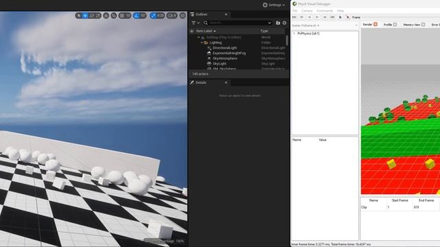 Small test showing side-by-side of the Unreal Engine scene and the PhysX Visual Debugger scene. This is a plugin I call UPhysxLib. It replaces the physics engine in most places that matter with PhysX and is entirely coded within a plugin to avoid messing with source code.