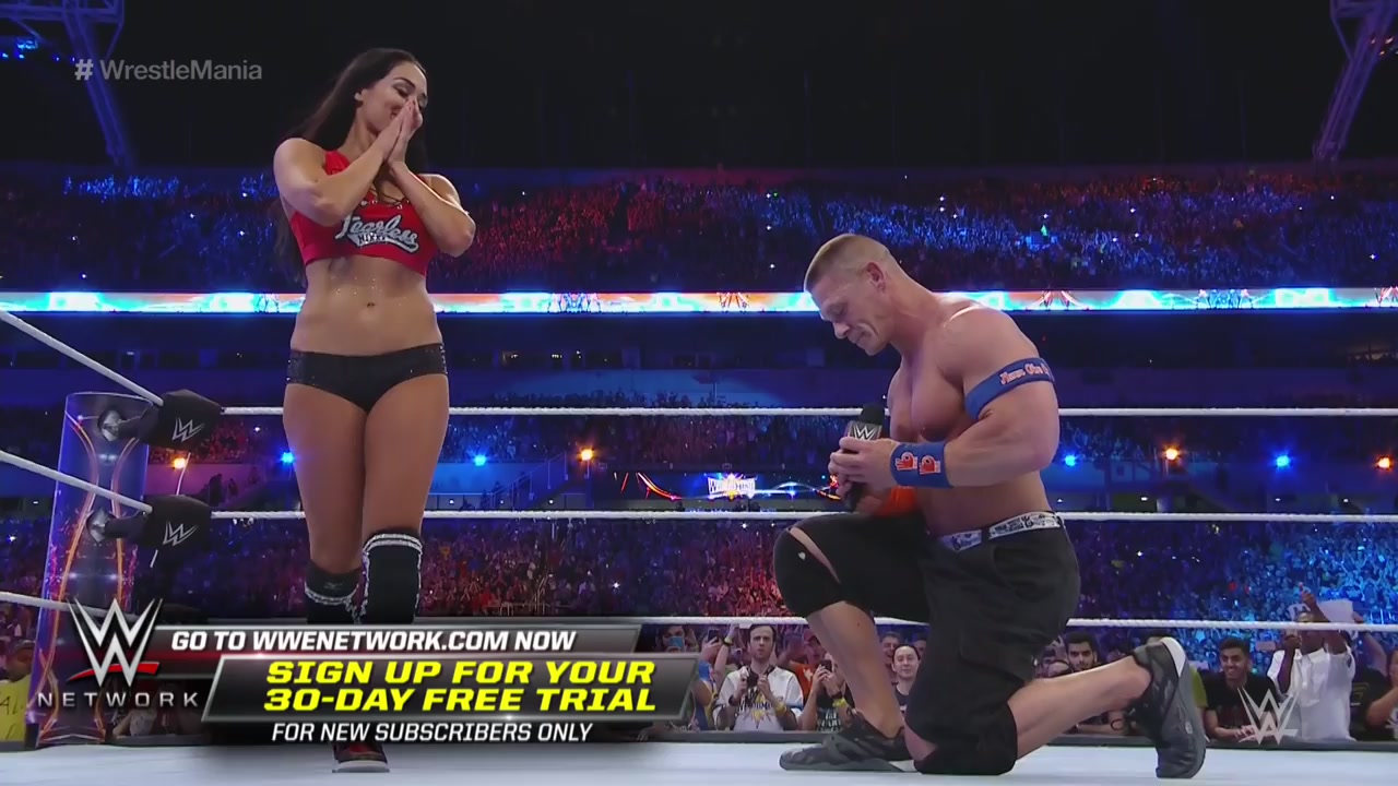 Американский рестлер Джон Сина сделал предложение своей девушке Никки Белле на ринге шоу «Рестлмания». Девушка растрогалась и ответила согласием.