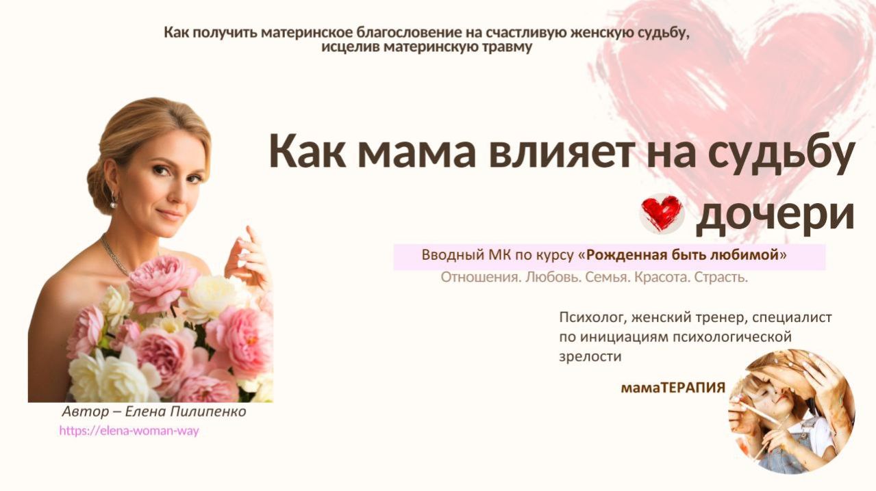 А у вас есть материнское благословение на счастливую судьбу? Сегодня прошла 1 часть МК «Как мама влияет на судьбу дочери» Вот что разобрали: — диагностику на контакт с женским миром — программы антиблагословления в отношениях, деньгах, теле — как антиблагословление проявляется в жизни — кто такая «еврейская» мама внутри нас — где мы застреваем и почему притягиваем не тех партнёров, имея пустой «горшочек» любви — тест благословления на любовь, доверие и безопасность На 2-й части разберём типы матерей и какой сценарий каждая из нас несёт в себе. 1-ю часть МК можно посмотреть в записи — пока доступно. Скоро закрою доступ. 👇 Напишите в комментарии: вы чувствуете материнское благословение в своей жизни?