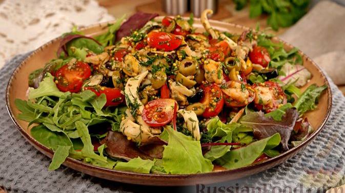 Веет морем и вкусной едой! САЛАТ С МОРЕПРОДУКТАМИ, ПОМИДОРАМИ И ОЛИВКАМИ