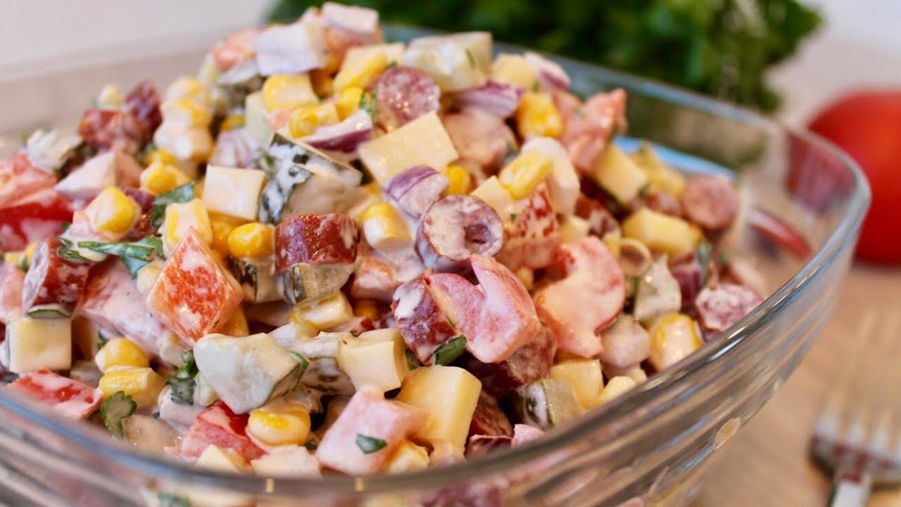 Приготовьте салат на каждый день или на праздничный стол, он готовиться быстро — ничего варить не надо, просто нарезал и смешал. РЕЦЕПТ: колбаса копченая 200 г кукуруза консервированная 100 г лук сладкий 1 шт помидор 1 шт перец болгарский 1 шт маринованные огурцы 2 шт сыр твердый 100 г петрушка 50 г майонез 100 г горчица 1 ч л перец молотый по вкусу Приятного аппетита! #салат #салаты #рецептысалатов #салатсколбасой #быстрыйсалат #простойсалат #простойрецепт #рецепты #рецептынакаждыйдень