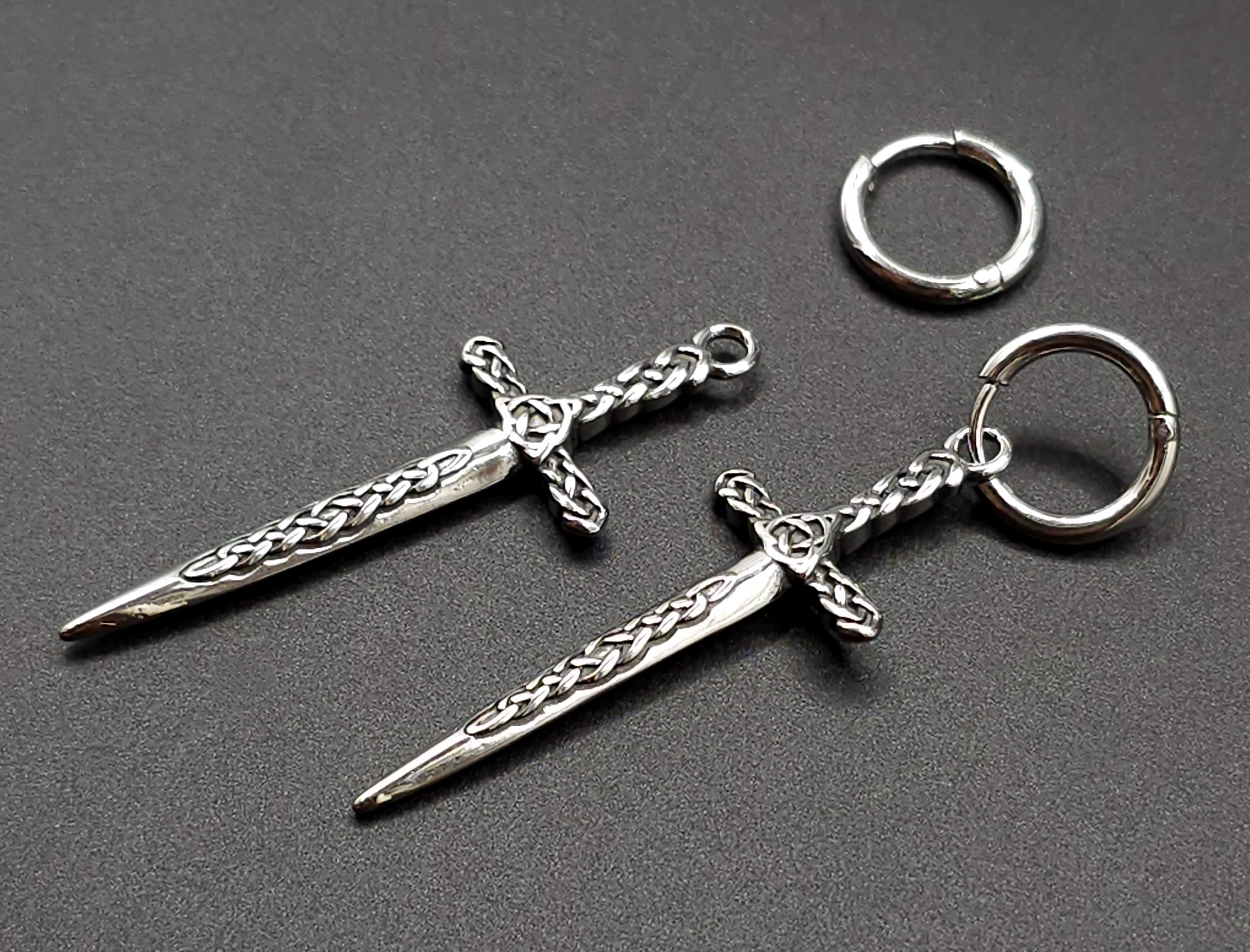 Starfallshop представляет уникальные дизайнерские серьги-конго со съемными подвесками "Скандинавский Клеймор" в серебряном цвете. Это идеальное украшение для тех, кто любит удивлять своим стилем и внешностью. Эти серьги обладают очень стильным, модным и трендовым дизайном, который непременно привлечет внимание окружающих. Они стали бестселлером благодаря своей готической эстетике и эксклюзивному, хорошо проработанному исполнению. Каждая деталь серьги выполнена с высокой детализацией, включая гравировку. Общая длина серьги составляет 5.8 см, диаметр хупа – 1.3 см, длина кинжала – 4.5 см, ширина подвески кинжала – 1.7 см. Вес одной серьги равен 4 граммам. Замок выполнен в стиле конго. Модель этих серег универсальна - они идеально подходят как для девушек, так и для мужчин, которым нравятся необычные и оригинальные украшения. Эти трендовые серьги станут модным и привлекательным дополнением к образу современной девушки или актуальным подарком. Авторские джекеты украшений от Starfallshop - это гарантия качества и оригинального дизайна. Не упустите возможность приобрести это уникальное украшение и выделиться из толпы своим стилем и вкусом! Хупы "Скандинавский Клеймор" доступны для заказа на Wildberries как моносерьга по арт. 179717572 и как парные серьги по арт. 179716964.