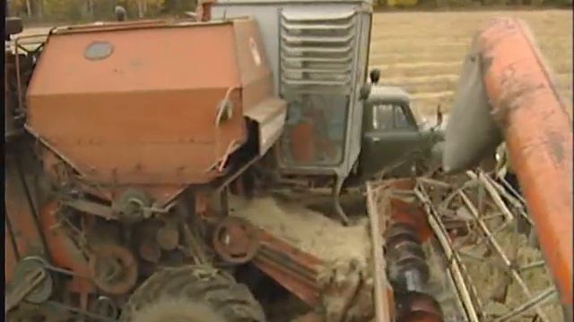 Свердловская область, уборка овса на комбайнах "Енисей-1200" и советской классике "Нива СК-5". Видны самые массовые грузовики СССР - ГАЗ-53. За давностью лет не помню название местности, где велась съёмка. Дата съёмки - сентябрь 2002 года, фрагменты исходного материала.