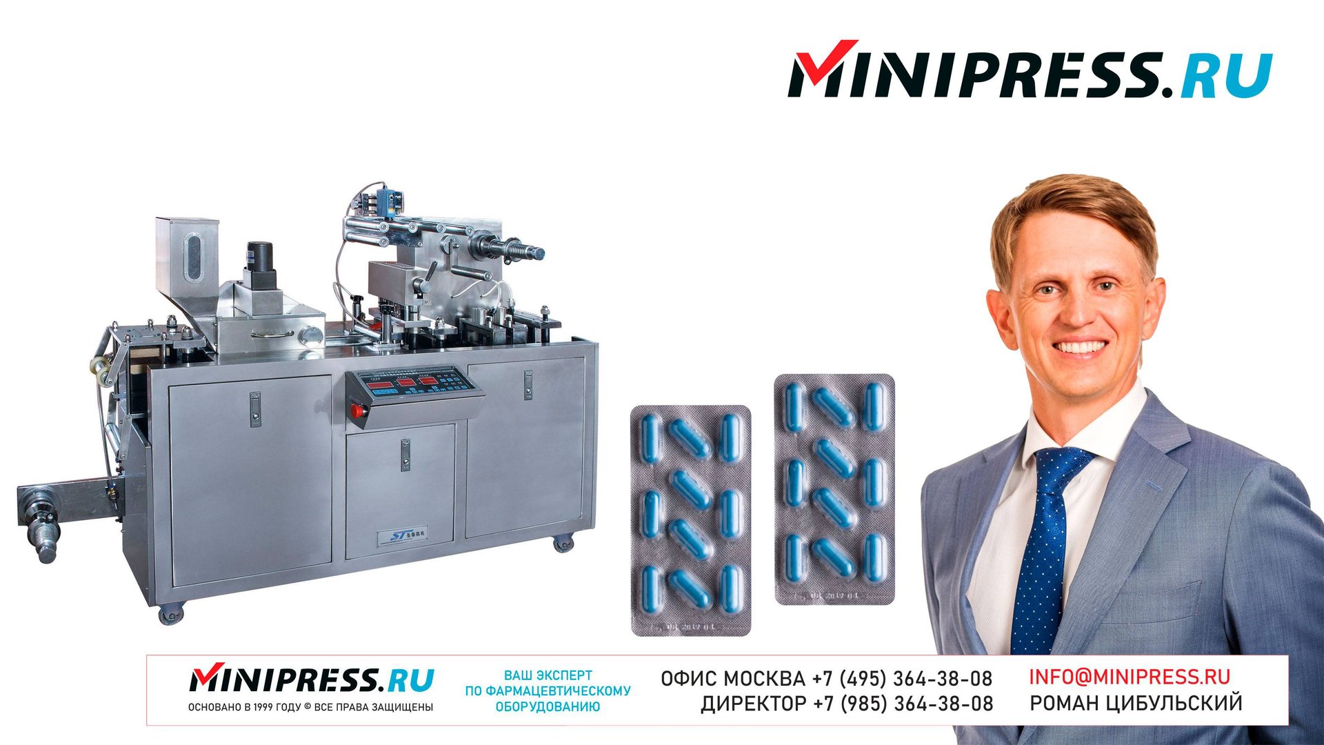Блистерная машина для упаковки в блистеры таблеток и капсул MN-80 https://Minipress.ru/katalog/ Фармацевтическое оборудование. Специалисты в фармацевтическом оборудовании и технологиях производства лекарств. Более 20 лет оказываем нашим клиентам помощь в выборе, поставке, наладке различного фармацевтического оборудования! Вы в поиске надежного поставщика оборудования? Мы предоставим вам лучший сервис 24/7. Собрана лучшая команда профессионалов в фармацевтической отрасли и налажены стабильные связи с лучшими производителями. Мы не только продаем, но и производим многие модели оборудования Директор компании Минипресс Роман Цибульский Поставка фармацевтического оборудования в Россию Пишите: info@minipress.ru Телефон +7(495)364-38-08; Мобильный +375(29)308-00-00 Россия, Москва Skype: RomanTsibulsky; ICQ: 310-134-490 Подписывайтесь на наш видео канал на Youtube https://youtube.com/user/wwwMinipressru Обновленный сайт https://Minipress.ru Каталог оборудования https://Minipress.ru/katalog/ МЫ В СОЦИАЛЬНЫХ СЕТЯХ G+ https://plus.google.com/+RomanTsibulsky/ FB https://facebook.com/roman.tsibulsky YOUTUBE https://youtube.com/user/wwwMinipressru IN https://ru.linkedin.com/pub/roman-tsibulsky/a6/933/661 БОЛЬШОЙ КАТАЛОГ ФАРМАЦЕВТИЧЕСКОГО ОБОРУДОВАНИЯ https://minipress.ru/katalog/ Постоянно обновляемый каталог различного фармацевтического оборудования с фотографиями, описаниями, видео и ценами. ПЕРСОНАЛЬНЫЙ МЕНЕДЖЕР 24 ЧАСА https://minipress.ru/katalog/ Вы общаетесь по всем вопросам, с момента первой консультации и до получения оборудования, с одним специалистом. СПЕЦИАЛИСТЫ И ТЕХНОЛОГИ https://minipress.ru/katalog/ Имеем обширные связи в фармацевтической среде, найдем любого специалиста, поможем с освоением оборудования и технологий. ОБСУЖДЕНИЕ ВАШИХ ИДЕЙ ПО ПРОИЗВОДСТВУ ПРОДУКЦИИ https://minipress.ru/katalog/ Поможем в оценке ваших идей. Большой опыт в организации различных производств и выпуске продукции. Ценные советы. ФАРМАЦЕВТИЧЕСКОЕ ОБОРУДОВАНИЕ Мы поставили перед собой задачу, помогать нашим клиентам в правильном выборе фармацевтического оборудования. Многолетний опыт подобной деятельности показывает, что многие клиенты сталкиваются, в первую очередь, с непониманием технологического процесса. Покупка оборудования должна быть финальной точкой после подробного обсуждения задачи, консультацией с производителем оборудования, отправкой сырья и материалов на фабрику, тестирования в работе. ДЛЯ ТАБЛЕТОК https://minipress.ru/katalog/category/farmacevticheskoe_oborudovanie/ Смешивание порошков, гранулирование, прессование, обеспыливание, покрытие оболочками, фасовка, упаковка, счет, нанесение логотипов ДЛЯ ЖЕЛАТИНОВЫХ КАПСУЛ https://minipress.ru/katalog/category/farmacevticheskoe_oborudovanie/kapsulyatory-dlya-tverdyh-zhelatinovyh-kapsul/ Фасовка порошков и масел, обеспыливание, счет и фасовка, упаковка, нанесение логотипов. ФАСОВКА И УПАКОВКА https://minipress.ru/katalog/category/upakovochnoe_oborudovanie/ Упаковка в пластиковые и стеклянные флаконы, блистер, фольгу, ламинированную бумагу, стеклянные ампулы, саше, стрипы, тубы, тюбики, контурную ячейку. ТЕХНОЛОГИЧЕСКОЕ https://minipress.ru/katalog/category/eksperimentalnoe-oborudovanie/ Лабораторное, аналитическое, подготовительное, отдельные машины и линии под ключ. СФЕРЫ ДЕЯТЕЛЬНОСТИ Наша компания занимается множеством направлений фармацевтического бизнеса! Предлагаем Вам посетить страницы нашего сайта https://www.Minipress.ru по различным специализациям. ОБОРУДОВАНИЕ ДЛЯ НАКЛЕЙКИ ЭТИКЕТОК НА БУТЫЛКИ АМПУЛЫ ФЛАКОНЫ https://minipress.ru/katalog/oborudovanie-s-otzyvami/oborudovanie-dlya-naklejki-etiketok-na-butylki-ampuly-flakony/ Автоматическое этикетировочное оборудование для этикеток на к