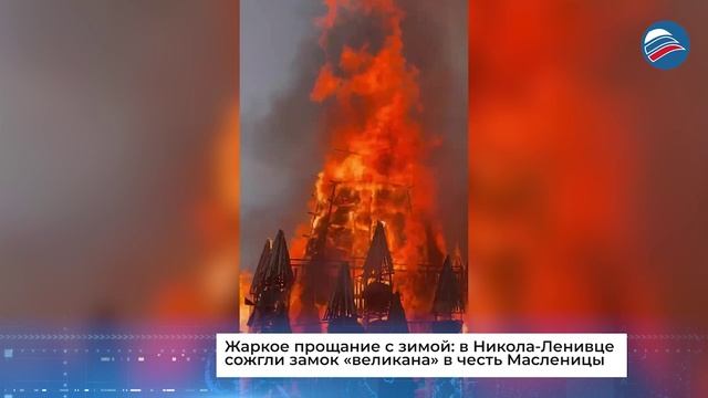 Жаркое прощание с зимой: в Никола-Ленивце сожгли замок «великана» в честь Масленицы