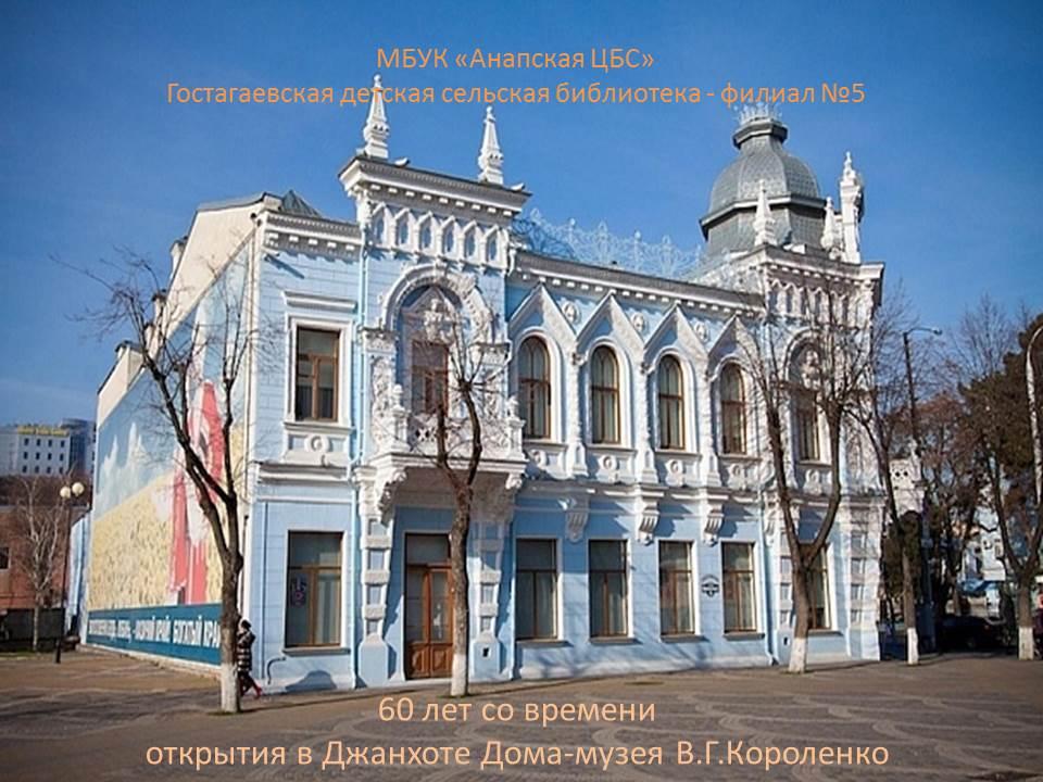 «Человек создан для счастья, как птица для полета» (В.Г.Короленко) В рамках акции «Ночь музеев-2024» Гостагаевская детская сельская библиотека-филиал № 5 подготовила онлайн-презентацию «Музеи Кубани», приуроченную к 60-летию открытия в Джанхоте Дома-музея В. Г. Короленко. В Доме-музее можно познакомиться с богатым литературным наследием писателя. Здесь хранится более пятисот его книг, а также библиотека, мебель и личные вещи автора, письма, фотографии, рецензии, рукописи. Выставлены редакторские работы и коллекции журналов. Джанхот привлекает туристов целебным воздухом, чистым морем и красивой природой. Здесь можно увидеть дом-музей писателя Владимира Короленко, бор пицундской сосны и дикий пляж «Голубая бездна». Произведения Владимира Короленко «Дети подземелья», «Слепой музыкант», «В дурном обществе», «Без языка» известны не только взрослым, но и каждому школьнику. Однако мало кто знает, что идеи и сюжеты своих творений писатель и публицист черпал в небольшом домике на Черноморском побережье, в окрестностях села Джанхот. Подготовлено библиотекарем Гостагаевской детской сельской библиотеки-филиала № 5 О.В. Грассман