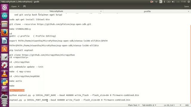 mkdir MicroPython ls -l sudo apt-get install make unrar autoconf automake libtool gcc g++ gperf \ flex bison texinfo gawk ncurses-dev libexpat-dev python-dev python python-serial \ sed git unzip bash help2man wget bzip2 sudo apt-get install libtool-bin git clone --recursive https://github.com/pfalcon/esp-open-sdk.git make STANDALONE=y cd gedit ~/.profile export PATH=/home/niwantha/MicroPython/esp-open-sdk/xtensa-lx106-elf/bin:$PATH PATH=$PATH:/home/niwantha/MicroPython/esp-open-sdk/xtensa-lx106-elf/bin pip install esptool git clone https://github.com/micropython/micropython cd ~/micropython git submodule update --init make -C mpy-cross cd ~/micropython/esp8266 make axtls make /dev/ttyUSB0 python esptool.py -p SERIAL_PORT_NAME --baud 460800 write_flash --flash_size=8m 0 firmware-combined.bin esptool.py -p /dev/ttyUSB0 --baud 460800 write_flash --flash_size=8m 0 firmware-combined.bin screen /dev/ttyUSB0 115200