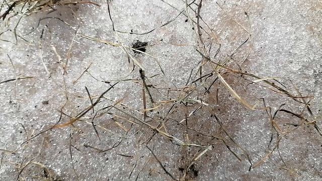 Муравей ползает по снегу в саду.