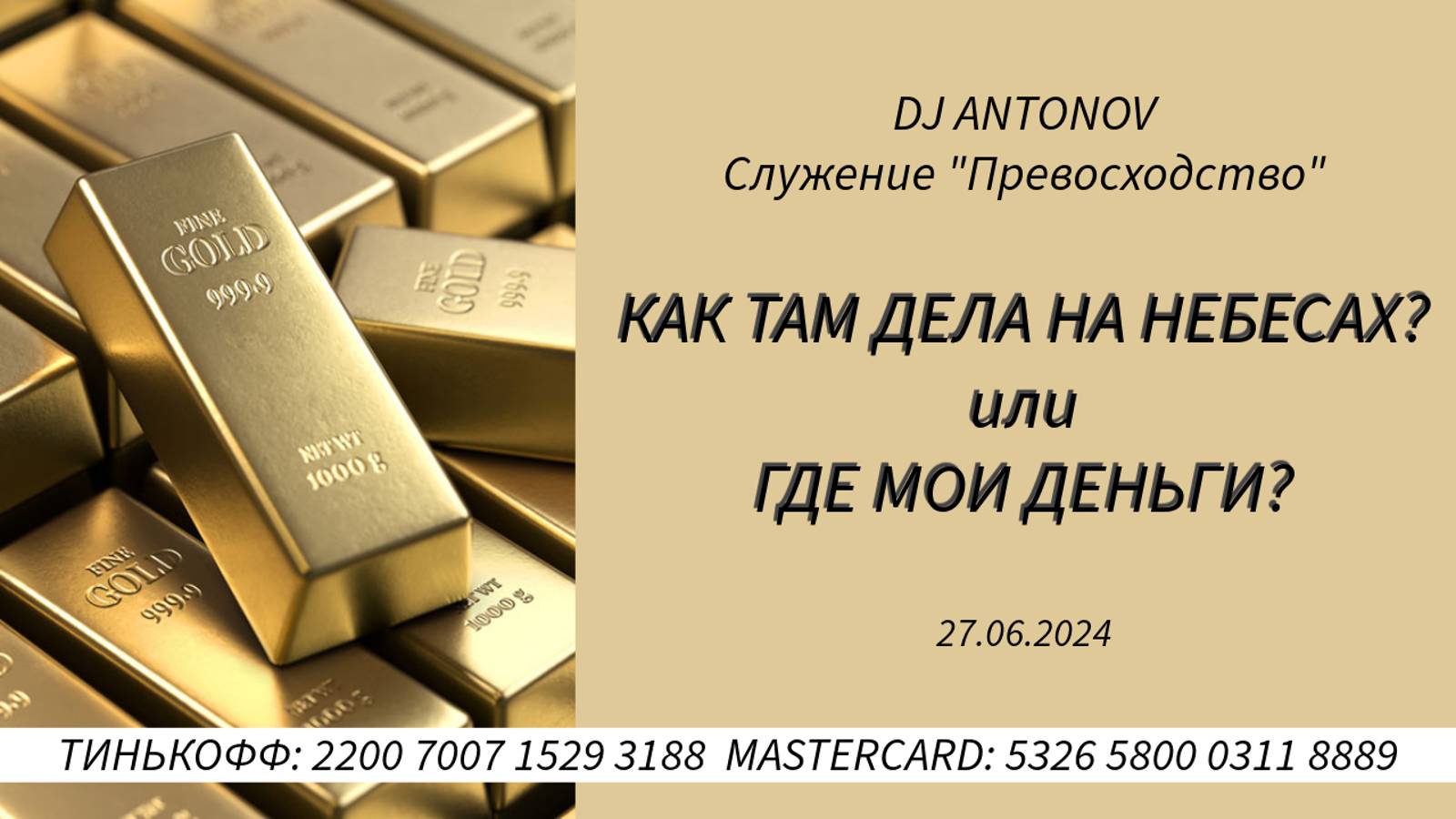 Быть богатыми - это ваше право! #djantonov #превосходство #деньгиприходят Если вы хотите сеять хорошее семя, то всегда давайте в те служения, которые вас питают. Сея в духовное, которое отвечает на ваши духовные вопросы и жизненные стремления и кормит ваш дух, вы сеете в то, что принесёт Божью жизнь в ваши обстоятельства. Пожертвовать в служение. TINKOFF КАРТА СИСТЕМЫ "МИР" VITALI ANTONAU Номер карты: 2200 7007 1529 3188 MASTERCARD Номер карты: 5326 5800 0311 8889 КОШЕЛЁК ЮМАНИ (ЯНДЕКС) НОМЕР: 4100 1704 1004 945 КАРТА ЮМАНИ (ЯНДЕКС ДЕНЬГИ) (для партнёров из России) Номер карты: 2204 1202 0163 9313 Через систему денежных переводов "MONEYGRAM" или "Золотая Корона" ( напишите на эмейл dj_antonov@mail.ru и Вам вышлют паспортные реквизиты для перевода) Крипто-кошелёк для пожертвований USDT через сеть (TRC20) TYFMGxeVagHkaXzhNkCpdVQ9XMKcx9Dh71 Пусть Бог умножит Ваше семя!!!