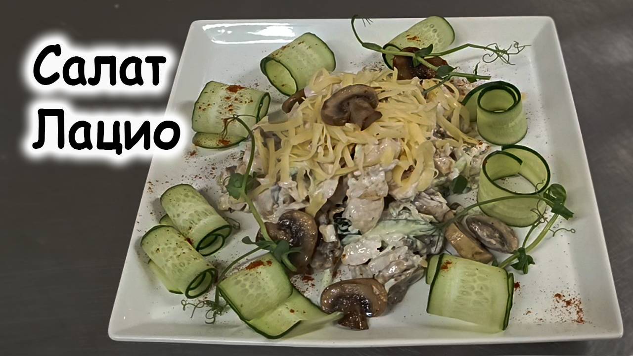 Шеф-Россия.рф скачать: книги, меню, ттк, рецепты, школа, мастер классы. Название «Лацио» может относиться к разным салатам. В зависимости от контекста, под «Лацио» понимают салат с курицей и грибами или салат с морепродуктами. Название происходит от итальянского региона Лацио, где эти ингредиенты широко используются в кулинарии. Банкетный зал "Адмирал" по адресу Митрофаньевское шоссе, дом 2, к. 1, БЦ Адмирал в Санкт-Петербурге - аренда банкетного зала С курицей и грибами Главные компоненты: свежие шампиньоны и обжаренное куриное филе. Шампиньоны обычно нарезают тонкими пластинами, куриное филе — на небольшие кусочки или полоски. В салат могут добавляться другие ингредиенты: свежие овощи (помидоры, огурцы, лук), зелень (укроп, петрушка), сыры (моцарелла, пармезан) и соусы (оливковое масло, лимонный сок, горчица). С морепродуктами В состав салата «Лацио» входят тёплые морепродукты и пикантные овощи (цуккини, баклажаны, перец, артишоки). Приготовление: Обработанные мидии, креветки, мини-кальмары посолить, поперчить, обжарить на смеси оливкового и сливочного масла. Овощи нарезать соломкой, смешать с салатами, заправить соусом «Лацио» и выложить горкой на тарелку. Вокруг разместить тёплые морепродукты. Украсить целыми маслинами и каплями соуса «Лацио». Соус «Лацио»: листья базилика, оливковое масло, сок лимона смешать в блендере до однородной массы, добавить кедровые орехи, чеснок (пюре) и тёртый сыр «Пармезан», всё перемешать. С морепродуктами Ингредиенты: rutube.ru свежие мидии — 90 г; креветки — 85 г; мини-кальмары — 75 г; соль, молотый перец — по вкусу; оливковое и сливочное масло — для обжаривания морепродуктов; овощи (цуккини, баклажаны, перец, артишоки) — нарезать соломкой; смесь салатов (руккола, оклиф, фризе) — 30 г; соус «Лацио» — 50 г (листья базилика, оливковое масло, сок лимона смешать в блендере до однородной массы, добавить кедровые орехи, чеснок (пюре) и тёртый сыр «Пармезан», всё перемешать). Приготовление: Обработанные мидии, креветки, мини-кальмары посолить, поперчить, обжарить на смеси оливкового и сливочного масла. Овощи нарезать соломкой, смешать с салатами, заправить соусом «Лацио» и выложить горкой на тарелку. Вокруг разместить тёплые морепродукты. Украсить целыми маслинами и каплями соуса «Лацио». Совет: для салата используют морепродукты первой свежести и свежие листья салата, морепродукты лучше использовать охлаждёнными. С курицей Ингредиенты (на 3 порции): куриное филе — 150 г; шампиньоны — 150 г; огурцы — 150 г; сыр гауда — 70 г; майонез — 100 г; тёртый сыр пармезан — 10 г; репчатый лук — 50 г; оливковое масло — 50 мл; соль, молотый чёрный перец — по вкусу; тимьян — 1 г. Приготовление: Подготовить куриную грудку: срезать с неё лишний жир и плёнки, посолить, поперчить и приправить свежим тимьяном. Обжарить грудку на раскалённом оливковом масле с двух сторон до золотистой корочки и довести до готовности в духовке при 180°С около 10–15 минут. Дать грудке остыть. Свежие шампиньоны промыть от грязи и земли, снять верхнюю кожицу с шляпки, если она старая, нарезать шампиньоны крупной соломкой. Репчатый лук порезать коротенькой соломкой и обжарить на раскалённой сковороде на оливковом масле до полуготовности. Затем к луку добавить подготовленные грибы и обжарить всё вместе до готовности, посолить и поперчить. Остывшую куриную грудку и свежие огурц