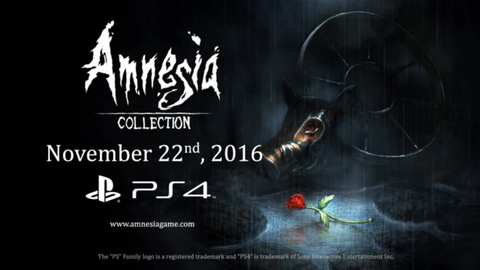 Студия Frictional Games объявила о том, что 22 ноября на PS4 выйдет сборник Amnesia: Collection, в состав которого входят хорроры Amnesia: The Dark Descent, Amnesia: Justine и Amnesia: A Machine for Pigs. Никаких улучшений по сравнению с компьютерными версиями игры не получили, но ничего и не потеряли.