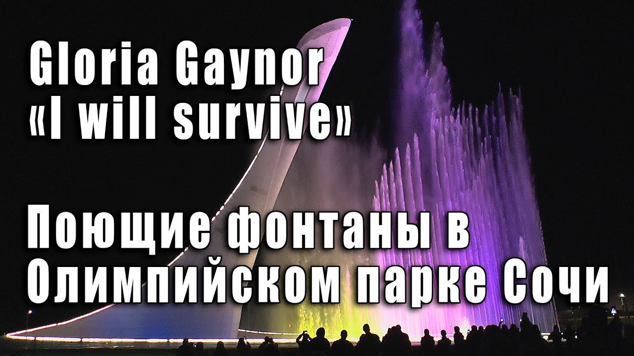 Поющий фонтан в Олимпийском парке Сочи. I Will Survive (Я выживу). Песня в исполнении Глории Гейнор (Gloria Gaynor) звучит в Олимпийском парке во время светомузыкального шоу поющих фонтанов (съёмка 2019 года). Олимпийский парк — один из главных объектов зимних Олимпийских игр 2014 года в Сочи, расположен на территории Адлерского района города Сочи, в Имеретинской низменности, на берегу Чёрного моря. На территории Олимпийского парка находятся главные спортивные сооружения, на которых проводились соревнования по хоккею с шайбой, конькобежному спорту, шорт-треку, фигурному катанию, кёрлингу, а также церемонии открытия и закрытия XXII зимних Олимпийских игр. I Will Survive. Авторы песни Дино Фекарис (Dino Fekaris), Фредди Перрен (Freddie Perren). At first I was afraid I was petrified I kept thinking I could never live without you by my side But then I spent so many nights Just thinking how you'd done me wrong And I grew strong I learned how to get along So now you're back From outer space I just walked in to find you here Without the look upon your face I should have changed my f-ing lock I would have made you leave your key If I'd have known for just one second You'd be back to bother me Oh now go, Walk out the door Just turn around now You're not welcome anymore Weren't you the one who tried to break me with desire Did you think I'd crumble Did you think I'd lay down and die Oh no, not I I will survive As long as I know how to love I know I'll be alive I've got all my life to live I've got all my love to give I will survive I will survive Yeah, yeah.