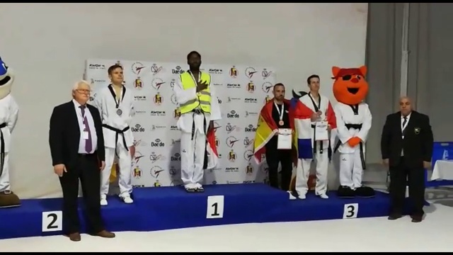 Au moment de la Marseillaise, Mamoudou Bassoum, ce médaillé d'or Français de Taekwondo célèbre sa victoire vêtu d'un gilet jaune en guise de constatation contre la politique du gouvernement.