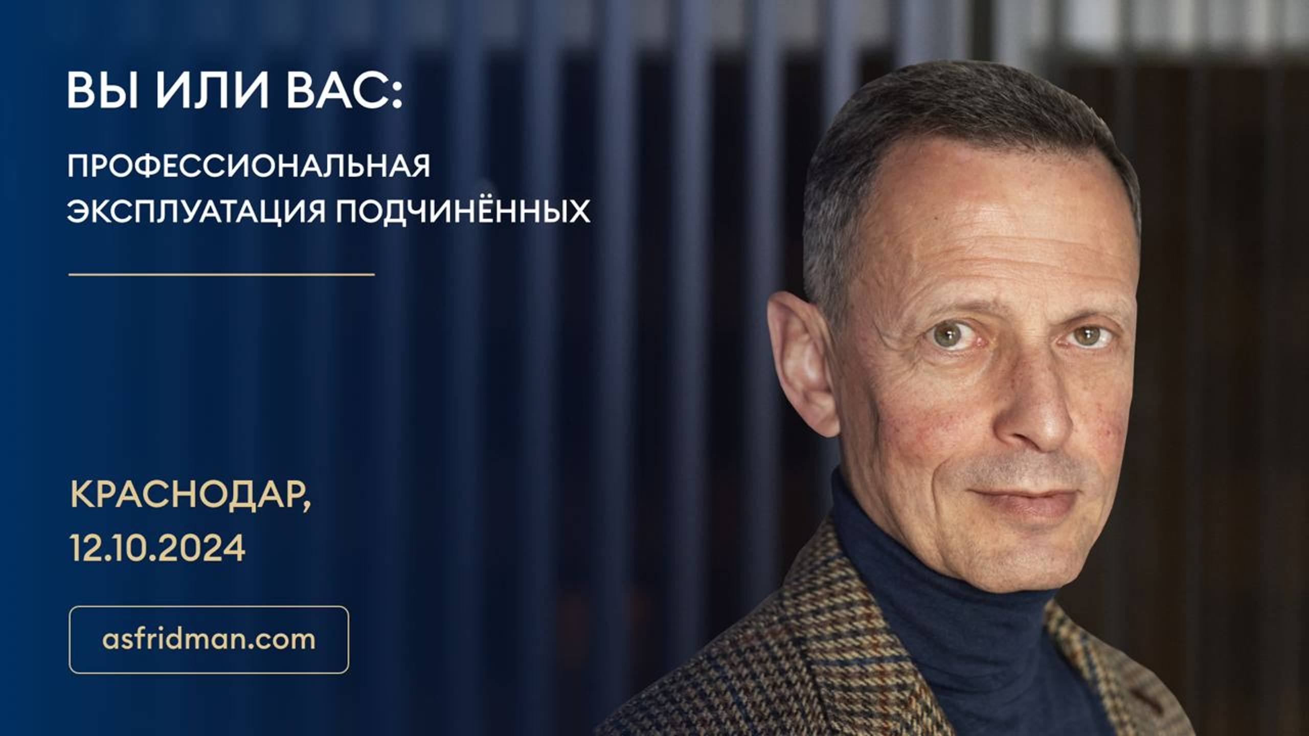 ВЫ ИЛИ ВАС: ПРОФЕССИОНАЛЬНАЯ ЭКСПЛУАТАЦИЯ ПОДЧИНЁННЫХ. Технологии регулярного менеджмента: основа, ключевые принципы, векторы и последовательность внедрения. Семинар Александра Фридмана в Краснодаре, 12 октября 2024 года. Подробности и регистрация: http://seminary-fridmana-krasnodar.tbk.com.ru/