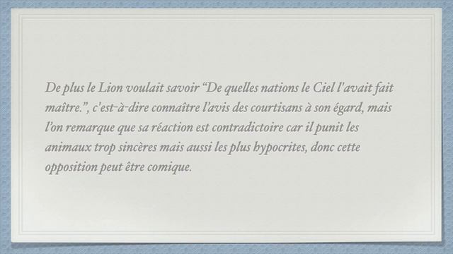 🥺Tu hésites sur ton orientation ? On te conseille par Chat SMS : envoie VOY5077 au 71700 Disclaimer : Lorsque tu cliques sur un lien d’affiliation, je peux recevoir une commission sans surcoût pour toi. Merci ! Explication détaillée de la fable "La Cour du lion" de La Fontaine : Une critique subtile de Louis XIV, le Roi Soleil Découvrez dans cet article l'explication de la célèbre fable de La Fontaine, "La Cour du lion", qui sert de critique voilée à l'un des monarques les plus influents de l'histoire de France, Louis XIV, le Roi Soleil. La fable de La Fontaine dépeint les intrigues et les abus de pouvoir qui caractérisent souvent les cours royales, tout en offrant une analyse approfondie de la personnalité du souverain. La fable "La Cour du lion" de La Fontaine : Résumé et analyse La fable "La Cour du lion" est l'une des œuvres les plus connues de Jean de La Fontaine. Elle met en scène un lion, représentant Louis XIV, le Roi Soleil, qui convoque tous les animaux de la forêt pour une audience. Au cours de cette audience, chaque animal doit louer le roi et exprimer son allégeance. Ceux qui ne parviennent pas à impressionner le souverain subissent sa colère et sont punis. La critique de Louis XIV, le Roi Soleil : Une satire de la cour En décrivant la cour du roi lion, La Fontaine critique subtilement les mœurs de la cour de Louis XIV, le Roi Soleil. Le lion, en tant que souverain, incarne l'absolutisme et l'arbitraire du pouvoir, tandis que les animaux représentent les courtisans prêts à tout pour plaire au roi. La fable met en lumière la flatterie, la corruption et les manœuvres politiques qui règnent dans les cercles du pouvoir. La Fontaine n'hésite pas à dénoncer la vanité de Louis XIV, le Roi Soleil, qui exige de ses sujets une soumission inconditionnelle et un culte de la personnalité. Il met en évidence la manière dont le souverain se laisse séduire par les flatteurs et les intrigants, au détriment de la justice et de l'intérêt général. Explication de la fable "La Cour du lion" : Les personnages et leurs rôles La fable "La Cour du lion" met en scène plusieurs personnages, dont le lion, l'âne, le renard et le loup, chacun représentant un type de courtisan et ayant un rôle bien défini dans la critique de Louis XIV, le Roi Soleil. Le lion, en tant que roi, incarne l'autorité absolue et les excès de pouvoir. L'âne représente les courtisans naïfs et maladroits, tandis que le renard symbolise les flatteurs et les intrigants. Enfin, le loup incarne les victimes des machinations et des abus de pouvoir. Conclusion La fable "La Cour du lion" de La Fontaine est une œuvre intemporelle qui offre une critique subtile et percutante de Louis XIV, le Roi Soleil, et de sa cour. En s'appuyant sur des personnages animaliers, l'auteur dénonce les abus de pouvoir, la flatterie et les manœuvres politiques qui caractérisent les cercles du pouvoir.