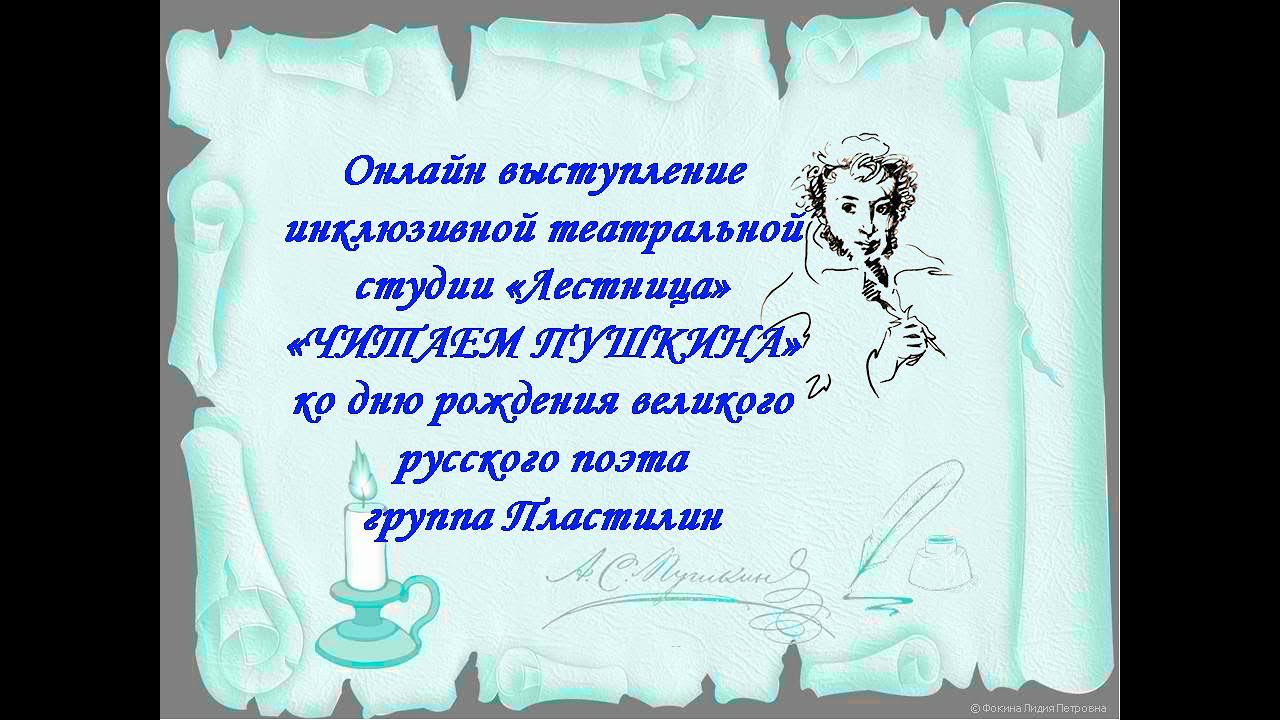 В День рождения Александра Сергеевича Пушкина 6.06.2020г актеры инклюзивной театральной студии "Лестница" подготовили онлайн выступление и прочитали стихи великого русского поэта. Проекты инклюзивной театральной студии "Лестница" реализуются при поддержке фонда президентских грантов. За запись и создание ролика благодарим Сергея Колотовкина.