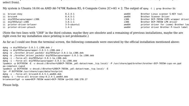 Ubuntu: Brother DCP-7055W scanner not found Helpful? Please support me on Patreon: https://www.patreon.com/roelvandepaar With thanks & praise to God, and with thanks to the many people who have made this project possible! | Content (except music & images) licensed under cc by-sa 3.0 | Music: https://www.bensound.com/royalty-free-music | Images: https://stocksnap.io/license & others | With thanks to user Maarten Fokkinga (https://askubuntu.com/users/514395), user K7AAY (https://askubuntu.com/users/197910), and the Stack Exchange Network (http://askubuntu.com/questions/1065096). Trademarks are property of their respective owners. Disclaimer: All information is provided "AS IS" without warranty of any kind. You are responsible for your own actions. Please contact me if anything is amiss at Roel D.OT VandePaar A.T gmail.com.