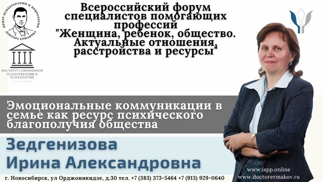 Зедгенизова Ирина Александровна, врач-психотерапевт, психиатр, психолог-психоаналитик, Аккредитованный супервизор ОППЛ, заместитель директора по лечебной работе Центра психотерапии и неврологии доктора Ермакова, заместитель директора по научной работе Института Современной Психотерапии и Психологии. Новосибирск, Россия. В докладе представлены виды эмоциональной коммуникации в семье и их значение в реализации потребностей ее членов. Рассматривается связь неудовлетворенных в детстве эмоциональных потребностей и вариантов дезадаптации во взрослом периоде жизни, возможные варианты их влияния на общество в целом. В докладе дано описание передаваемых через поколения дисфункциональных эмоциональных паттернов и их роли в формировании различных видов психопатологии. Описываются возможные альтернативные виды и способы формирования внутрисемейных эмоциональных связей, анализируется роль психологического просвещения и психотерапевтической поддержки с разными группами клиентов. Всероссийский форум специалистов помогающих профессий "Женщина, ребенок, общество. Актуальные отношения, расстройства и ресурсы" Канал ИСПП в телеграмм: https://t.me/isppnsk Группа ИСПП в Вконтакте: https://vk.com/modernpsychoterapy Центр Психотерапии и Неврологии доктора Ермакова: Телеграмм: https://t.me/doctorermakov Вконтакте: https://vk.com/doctorermakov