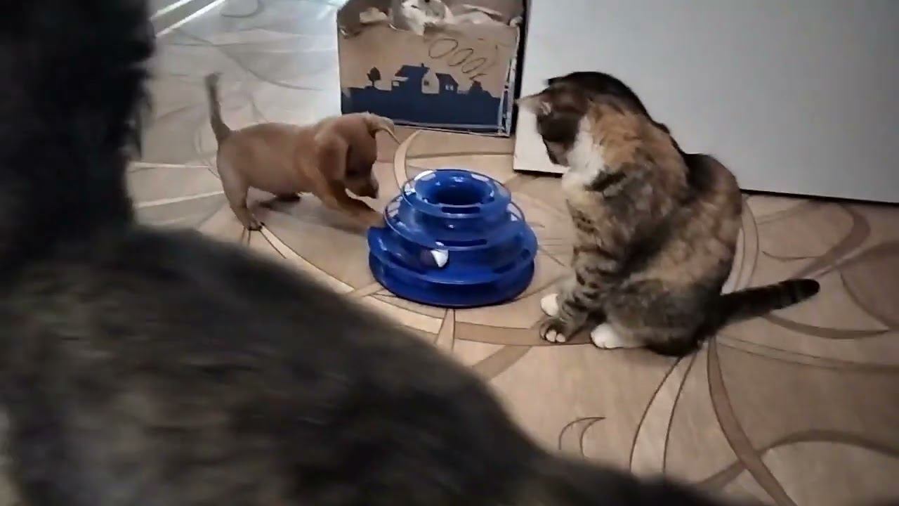 Щенкам понравилась еошачья игрушка