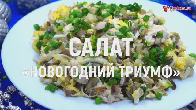 Салат «Новогодний триумф», этот салат с курицей, грибами, маринованными огурцами, все ингредиенты которого прекрасно сочетаются и этот нежный новогодний салат тому подтверждение. Еще больше рецептов смотрите на нашем сайте https://kedem.ru/recepty-s-foto/ Время приготовления : 30 минут. Ингредиенты: 200 г куриного филе, 50 г твердого сыра, 5 свежих шампиньонов, 2 яйца, 2 маринованных огурца, 2 ст. ложки майонеза, 1 луковица, 2 ст. ложки растительного масла, зеленый лук для украшения. Приготовление: Куриное филе хорошо вымыть. Луковицу, зеленый лук и грибы вымыть и очистить. Отварить куриное филе 15-20 минут и остудить в бульоне. Отварить 2 яйца, остудить и очистить. Грибы мелко нарезать. Очищенную луковицу мелко нашинковать. На сковороде разогреть 2 столовые ложки растительного масла. Обжарить грибы с луком, помешивая 5-6 минут на среднем огне. Готовые грибы с луком остудить. 2 маринованных огурца нарезать кубками. Зеленый лук мелко нашинковать. 50 грамм твердого сыра натереть на терке. 2 отварных яйца натереть на терке. Отварное куриное филе мелко нарезать. В большой миске смешать обжаренные с луком грибы, Нарезанное куриное филе, нарезанные маринованные огурцы, Добавить натертые отварные яйца и тертый сыр. Заправить 2 столовыми ложками майонеза и перемешать. Перед подачей посыпать мелко нашинкованным зеленым луком. Салат «Новогодний триумф» готов. Подавать к Новогоднему столу. Приятного аппетита! Счастливого Нового года! #кулинарныйэдем #еда #рецепты #вкусно #кулинария #рецепт #чтоприготовить #новыйгод #новогоднийстол #рождество