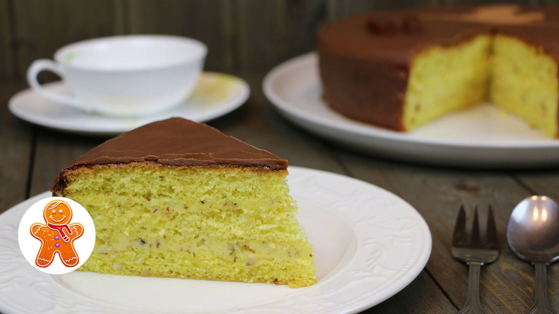 На форму 22–24 см Для бисквита: 5 крупных яиц 160 г муки (я заменила 1 ст. ложку муки крахмалом) 150 г сахара 25 г сливочного масла 30 г рубленых орехов (фундук, миндаль, арахис) Для крема: 150 г сгущенного молока с сахаром 50 мл воды 3 желтка 250 г сливочного масла 50 г рубленых орехов (фундук, миндаль, арахис) 1 ч. ложка ванильного сахара или несколько капель ванильной эссенции Для глазури: 100 г молочного шоколада 60 г сливочного масла Для смазывания торта перед глазировкой: 3–4 ст. ложка густого мармелада или повидла какао-порошок, цукаты для украшения Вес торта 1,1–1,2 кг