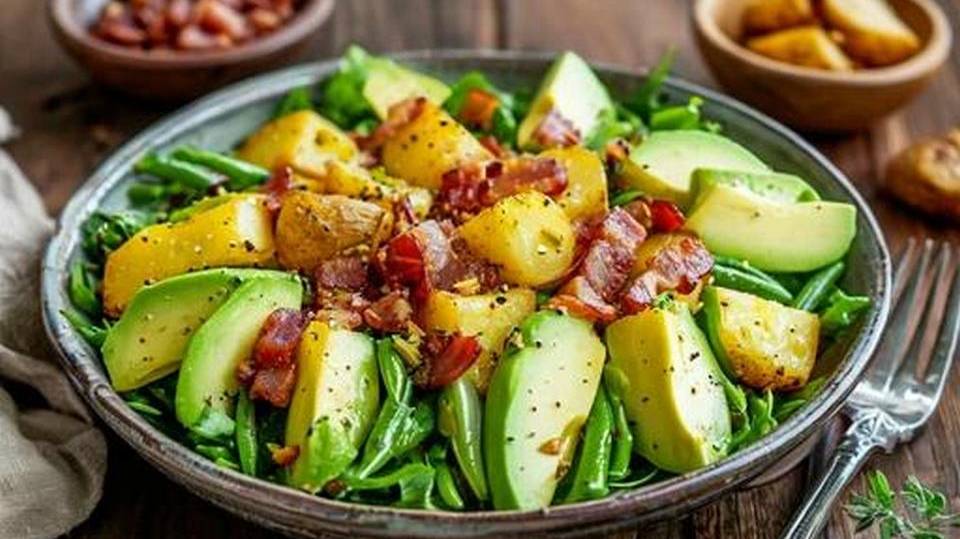Бекон с картофелем, стручковой фасолью и авокадо
