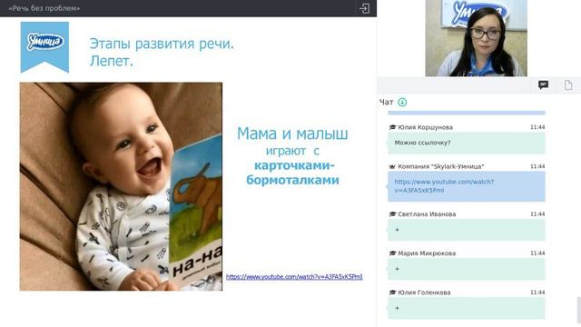 «День рождения Умницы»! С 6 по 15 ноября совершите любую покупку на сайте www.umnitsa.ru, по телефону горячей линии 8-800-200-08-07 или в фирменных магазинах «Умницы» и получите гарантированный подарок! Подарок вы можете выбрать в корзине. Скачать презентацию можно по ссылке: https://cloud.mail.ru/public/AuBr/5oiS8qprs На вебинаре мы обсудим: Что есть «речевые нормы» в каждом возрасте? Как понять, нормально ли развивается речь моего ребёнка? Что делать, если малыш плохо разговаривает? Как избежать логопедических проблем в будущем? Мы познакомим вас с набором «Говорим с пелёнок» - легендой от компании «Умница». Этот комплект был разработан логопедами, он включает в себя детальную программу занятий на несколько лет вперёд и все материалы для игр с ребёнком.