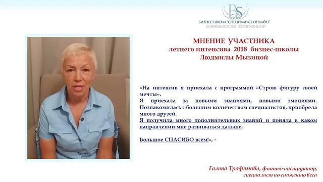 Фитнес-тренер Г.Трофимова об интенсиве школы Людмилы Мызиной "СПЕЦИАЛИСТ-ОНЛАЙН"