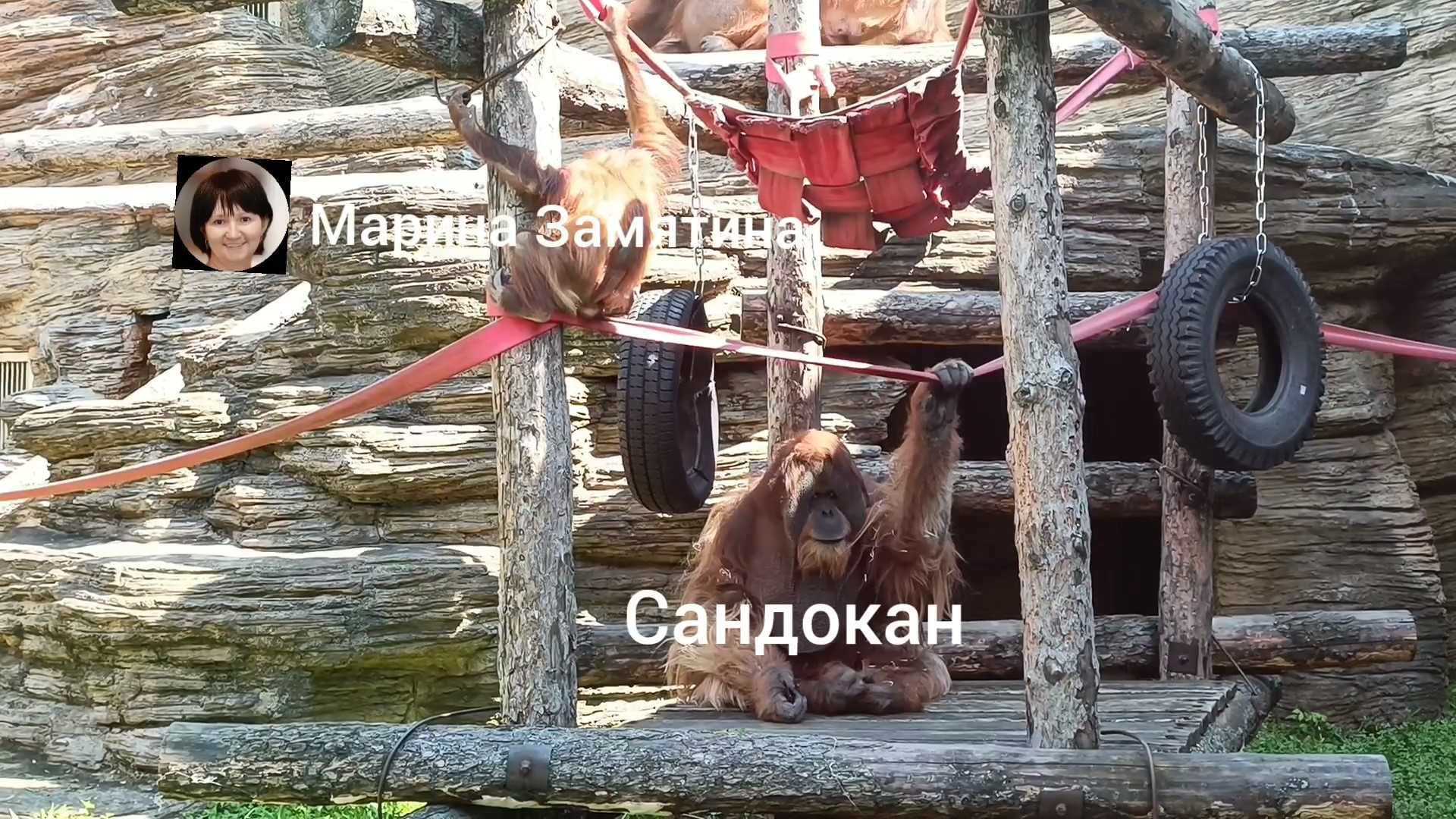 Семья суматранских орангутанов гуляют в уличном вольере.