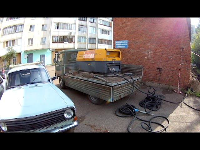 Выезд компрессора с отбойными молотками для вскрытия асфальта при проведении работ по замене канализационных выпусков. Предоставляем услуги аренды компрессора с отбойными молотками в г. Уфе. Почасовая аренда компрессоров 3 куб.м/мин